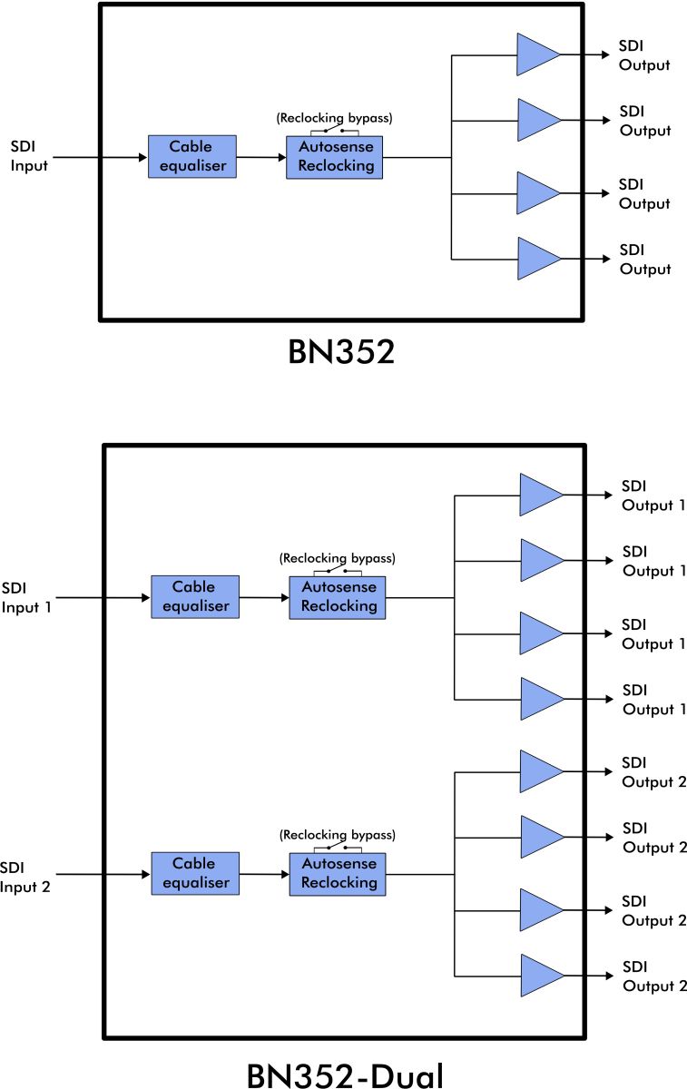 The BN352-DUAL variant offers 2x 1:4 reclocked distribution, equalisation, and SMPTE-compliant performance making it especially suited for OB trucks and tight-space installations. With lockable BNC connectors and LED indicators for quick signal status checks, it provides the same rugged reliability as the BN352 in a more space-efficient format.